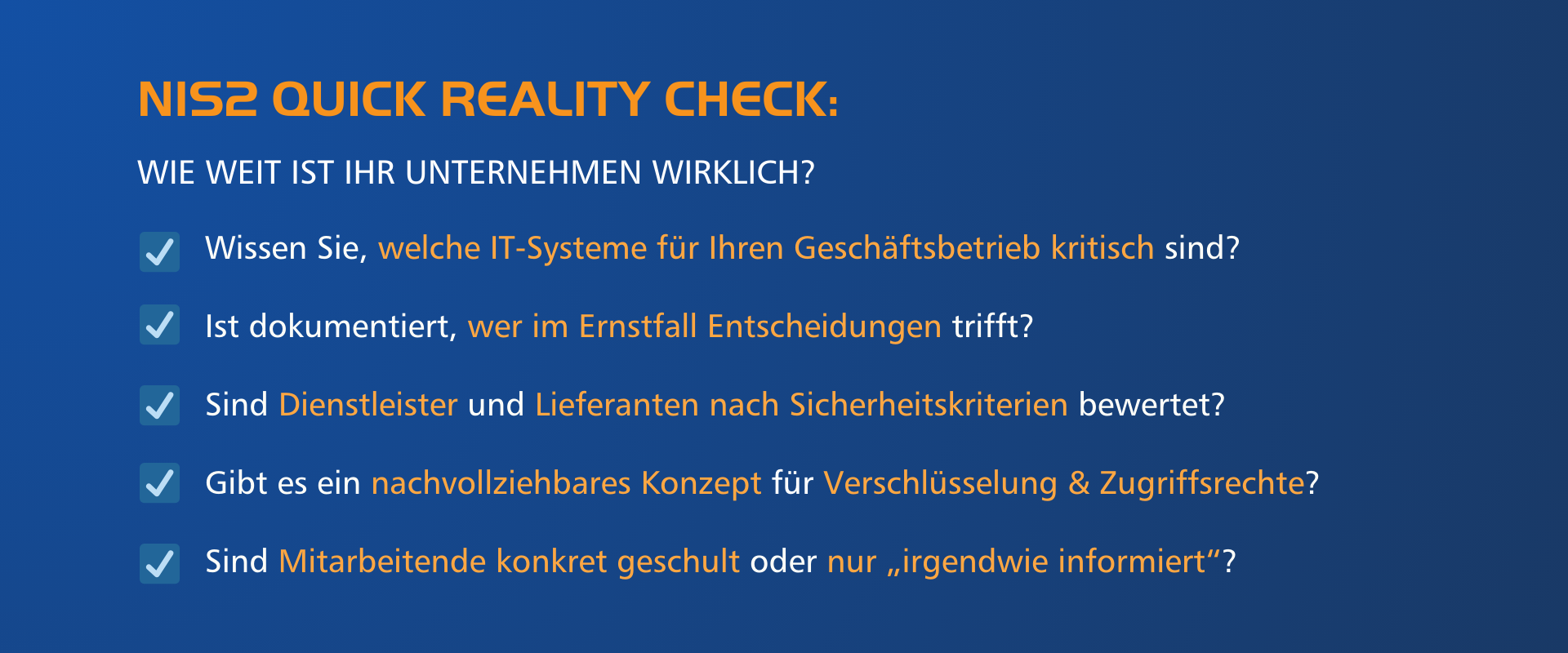 ✅ Mit unserem NIS2 Quick-Check schaffen wir Transparenz und zeigen pragmatisch auf, wo Sie stehen und welche Schritte sinnvoll sind.